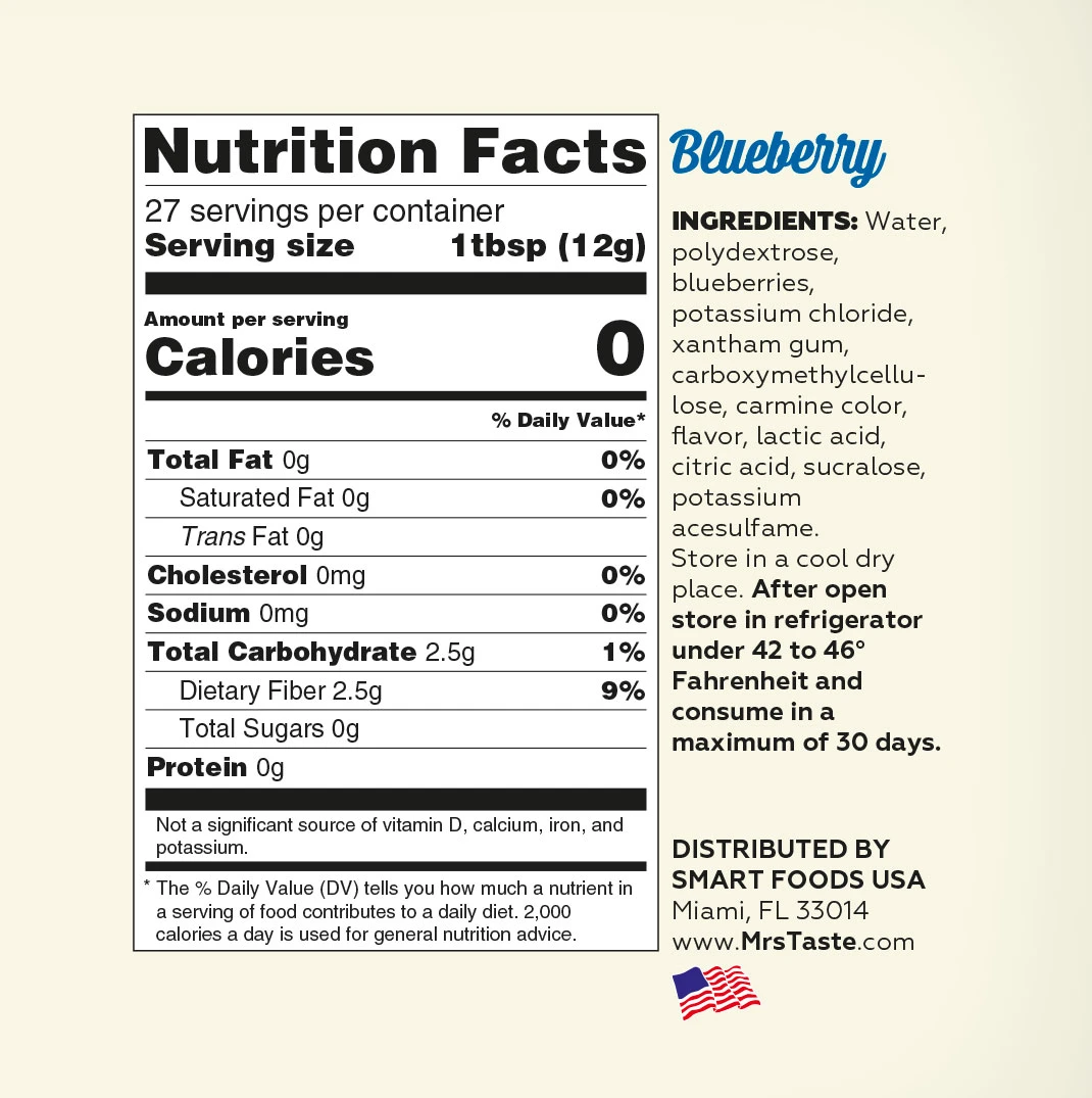 El jarabe de Mrs Taste Blueberry se puede utilizar con comodidad en helados, pasteles y otros postres de su dieta. Conservar en un lugar fresco y seco. Una vez abierto, conservar en nevera por debajo de 6 a 8 ° C y consumir en 30 días como máximo.
